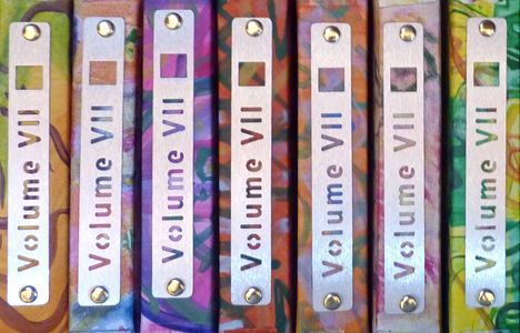 Volume VII is a goodie box filled with unique art objects. Each box is individually painted, has a laser cut aluminum spine plate, and includes: