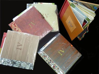 Volume V is a reconfigured box with a Mica window, framed with a beveled mat, reinforced with an aluminum, embossed spine, stitched with Baker's cord dipped in beeswax, encasing the memorial scroll of Bella Bellisimo. The boxes are lined with paste paper, contain five chapbooks, and have a vintage button closure. The storyline in this book captures a year of turning points and the art follows along. This edition has been described as "a real page turner."