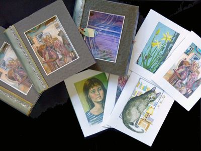 Volume IV is an accordion-style book with twelve individual pockets, packed with information about each month of the year and representing the four seasons - experienced through plein air painting. The cover is created from engraved Marmoleum (a type of linoleum). The spines are book-cloth that I made. The end pages are paper I marbleized in my friend Trudy Thompson's studio. This was a year of many events, from a fundraiser for a wildlife rehabilitation center to a high school reunion out on Fire Island.